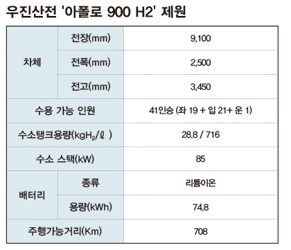 한편 우진산전의 수소버스 첫 개발품 아폴로 900 H2는 85kW 스택을 기반으로 정부 구매보조금 약 1억 9,205만 원, 지자체 보조금(서울 기준) 약 8,250만 원을 포함해 총 2억 7,455만 원의 지원을 받을 수 있을 전망이다.