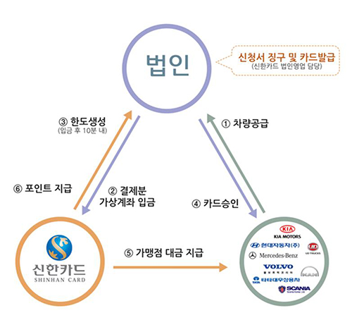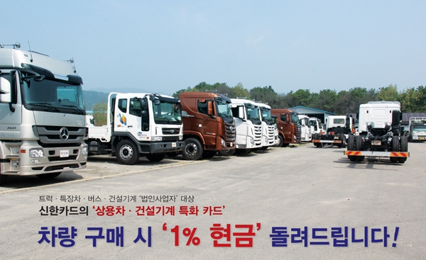 국내 최대 카드운용사인 신한카드는 트럭, 특장차, 버스 등 상용차와 굴삭기 등 일부 건설기계를 이용해 사업을 영위하는 법인사업자가 더 나은 조건으로 차량을 구매할 수 있는 ‘상용차·건설기계 특화 카드’를 출시, 법인사업자들로부터 큰 인기를 얻고 있다.