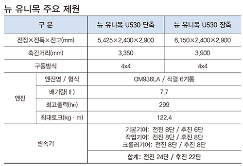 국내에 새롭게 출시된 뉴 유니목 유로6 모델 라인업은 다목적 장비 장착용 차량 뉴 유니목 UGE 시리즈(U423, U427, U430, U527, U530)와 오프로드 운송에 특화된 뉴 유니목 UHE시리즈(U4023, U5023)로 구성된다.
