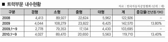 중·대형 카고트럭 자가용 수요 몰려 중·대형트럭 역시 올들어 판매호조를 보이고 있다. 물류운송업체 및 특장차 운송업자가 가장 선호하는 중형트럭(2.5톤~7톤)의 경우 작년 판매대수는 경기침체에도 불구, 2008년의 2만2,624대에 비해 다소 증가했고, 올들어서도 지난 9월까지 2만650대로 작년 같은기간의 1만7,134대에 비해 무려 17.0% 증가했다.