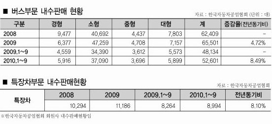 2008년 7,803대에서 2009년 7,157대로 판매대수가 9.0% 감소한 대형버스는 올들어 9월까지 5,899대로 작년 같은기간의 5,573대에 비해 5.5% 증가하는데 그쳤다. 이는 버스 전체 내수판매 증가율8.49%에 휠씬 못미치는 수준이다.