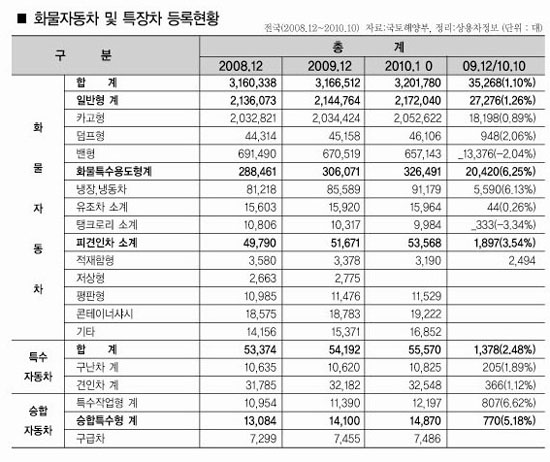 국토해양부의 화물자동차 등록대수를 분석해 보면 올들어 전반적인 화물차 증가세가 두드러지고 있는 가운데, 일부 차량을 제외한 특장차 대부분 증가하는 현상을 보이고 있다.