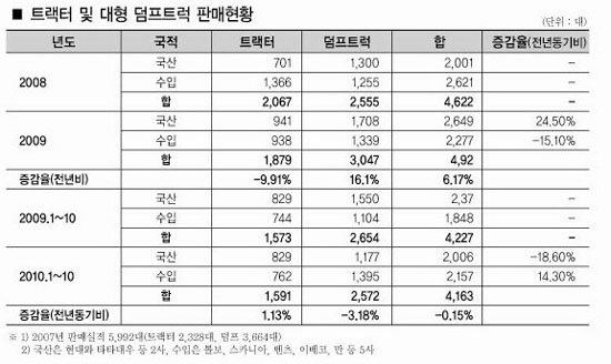 특히 정부의 4대강 사업과 관련하여 대형 덤프트럭이 작년에 큰 폭으로 판매증가율을 보인 반면, 물류운송용의 트랙터는 반대로 극히 부진한 실적으로 나타나고 있다.