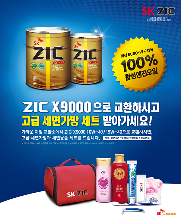 SK루브리컨츠에 따르면, 5월말부터 자사의 플래그십 상용차 엔진오일인 ‘ZIC X9000(10W-40, 15W-40)’으로 교환하는 고객들을 대상으로 고급 세면가방 세트 증정한다고 밝혔다.