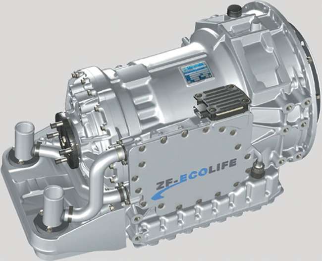 ZF EcoLife(에코라이프)는 최첨단 지능형 자동변속기로 △ 신규 일체형 변속기 전용 열교환기(듀얼 냉각 방식으로 향상된 냉각 성능) △ 일체형 토션 댐퍼 적용으로 진동 감소 및 연료 절감 △ 향상된 성능의 프라이머리 리타더를 통해 개선된 안전성 △ 변속기 상단에 장착된 일체형 ECU △ 헬리컬 기어로 소음 감소 효과 극대화 △ 진단 장비의 연결이 가능한 운전석 푸시 버튼 스위치 등을 적용함으로써 최대의 연비 절감 효과와 탁월한 성능을 제공하고 있다.