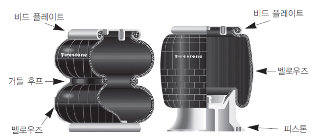 모든 에어스프링 작동원리는 같다. 에어스프링 내부의 공기압력으로 하중을 지지한다. 즉 공기압력의 세기와 에어스프링의 직경에 비례해 에어스프링의 하중능력이 결정된다.