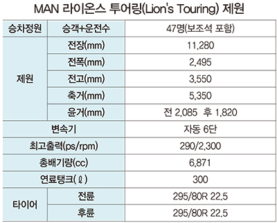 MAN 라이온스 투어링의 전장×전폭×전고는 11.3m×2.5m×3.65m 다. 천정 개방 시 전고 역시 3.65m로 높아 쾌적한 실내 공간이 특징이며, 승객은 최대 45명까지 탑승 가능하며 승〮하차가 편리하도록 설계되어 있다.