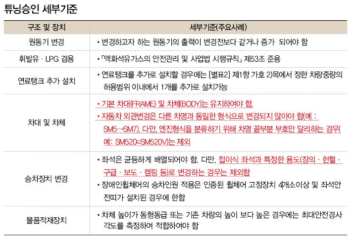 | 튜닝승인 세부기준(제5조 관련) 1. 기본원칙 : 자동차관리법 제29조의 안전기준에 적합하여야 튜닝이 가능하다. 다만, 다음 각 목의 경우 튜닝승인을 하여서는 아니 된다. 가. 총중량이 증가되는 튜닝 1) 승합자동차의 천정을 높이는 경우(예 TV, 오디오 등 설치하는 경우), 다만, 구급차, 장애인용 자동차는 제외한다. 2) 승용자동차 및 경형․소형자동차의 차량중량이 120kg을 초과하여 증가되는 경우와 중형자동차의 차량중량이 200kg(다만, 승합자동차의 특수형․화물자동차의 덤프형 및 특수용도형․특수자동차의 구난형 및 특수작업형은 100kg)을 초과하여 증가되는 경우(초과하는 차량중량은 시행규칙 제39조의 규정에 따라 자동차제작자등이 성능시험대행자에게 통보한 제원표에 표기된 차량중량 중 선택사양이 제외된 차량중량과의 차이를 말한다) 나. 변경전보다 성능 또는 안전도가 저하될 우려가 있는 다음 각 호의 경우 1) 차실에 캠핑 및 취사장비를 설치한 자동차가 소화기․전기개폐기․조명장치․환기장치 및 오수집수장치 등을 갖추지 않은 경우 2) 승합자동차 뒷좌석을 제거한 후 쇼파 등을 설치하는 경우 3) 자동차에 보조조향핸들을 설치하거나, 안전기준에 적합하지 않은 등화장치를 설치하는 경우(다만, 도로작업용 차량에 설치하는 유도표시등은 제외한다) 4) 차체 및 차대 전체가 늘어나거나 줄어드는 가변형으로 변경하거나, 안전기준에 적합하지 않게 차체의 길이를 변경하는 경우(다만, 도로작업용 차량에 충격흡수장치를 설치하는 경우는 제외한다) 5) 전 방향 승차장치를 옆 방향 승차장치로 변경하는 경우 6) 자동차의 차축을 추가 설치 또는 제거하거나 축간거리가 길어지는 경우 7) 일반형 화물자동차에 적재함 문짝을 제거하거나 축소하는 경우 8) 배기가스발산방지장치, 소음방지장치 등을 제거하는 경우 9) 활어운송용자동차 등에 화재를 사전에 예방할 수 있는 별도의 전기안전장치(휴즈, 누전차단기 등)가 설치되어 있지 않은 경우 다. 「액화석유가스의 안전관리 및 사업법 시행규칙」 제40조제2호에 따라 액화석유가스 연료사용이 허용되는 7인승 이상의 승용자동차가 6인승 이하로 변경되는 경우 |