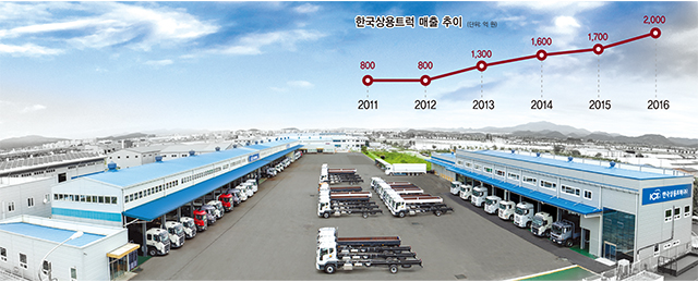 생산 및 판매대수 2,400여 대, 매출 2,000억 원. 작년 한 해 동안 한국상용트럭㈜이 일궈낸 실적이다. 국내 특장차 및 가변축 프리미엄 브랜드로 우뚝 솟은 한국상용트럭의 이같은 매출실적은 2011, 2012년 800억 원, 2013년 1,300억 원, 2014년 1,600억 원에 이어 2015년 1,700억 원(판매량 1,900여 대)과 비교해 보면, 실로 엄청난 성장세다. 국내 경기가 좋든 나쁘든, 한국상용트럭은 2009년 3월 법인 설립 이래 단 한 해도 거르지 않고, 매년 플러스 성장을 구가해 왔다. 이런 흐름은 결국 국내 특장차 및 가변축 시장에서 안정적인 시장점유율을 높이는 계기로 작용했다.