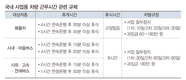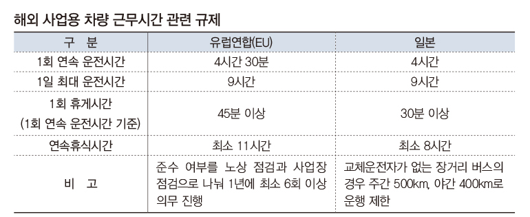 실제로 유럽연합(EU)은 일일 최대 운행시간이 9시간을 초과할 수 없고, 휴게시간도 4시간 30분 운행 시 최소 45분의 휴게시간을 의무화하고 하루 11시간을 나누어 쉬되 두 번째 휴식시간은 9시간 이상으로 규정했다.
