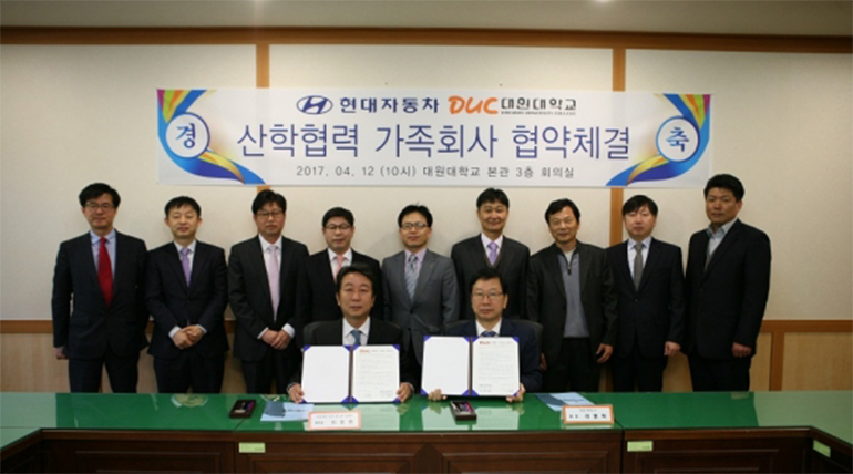 현대자동차와 대원대학교가 지난 12일 제천지역 상용차정비에 필요한 전문 인력 양성을 위해 ‘산학협력가족회사 협약’을 체결했다고 밝혔다.