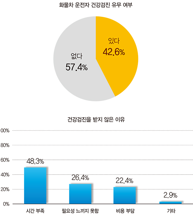실제로 한국산업보건연구원이 건강검진을 한 번도 받지 않은 화물차 운전자 174명을 대상으로 그 이유에 대해 묻자 48.3%가 시간부족을 가장 큰 이유로 꼽았다. 필요성을 느끼지 못한다(26.4%), 비용이 부담스럽다(22.4%)가 뒤를 이었다.