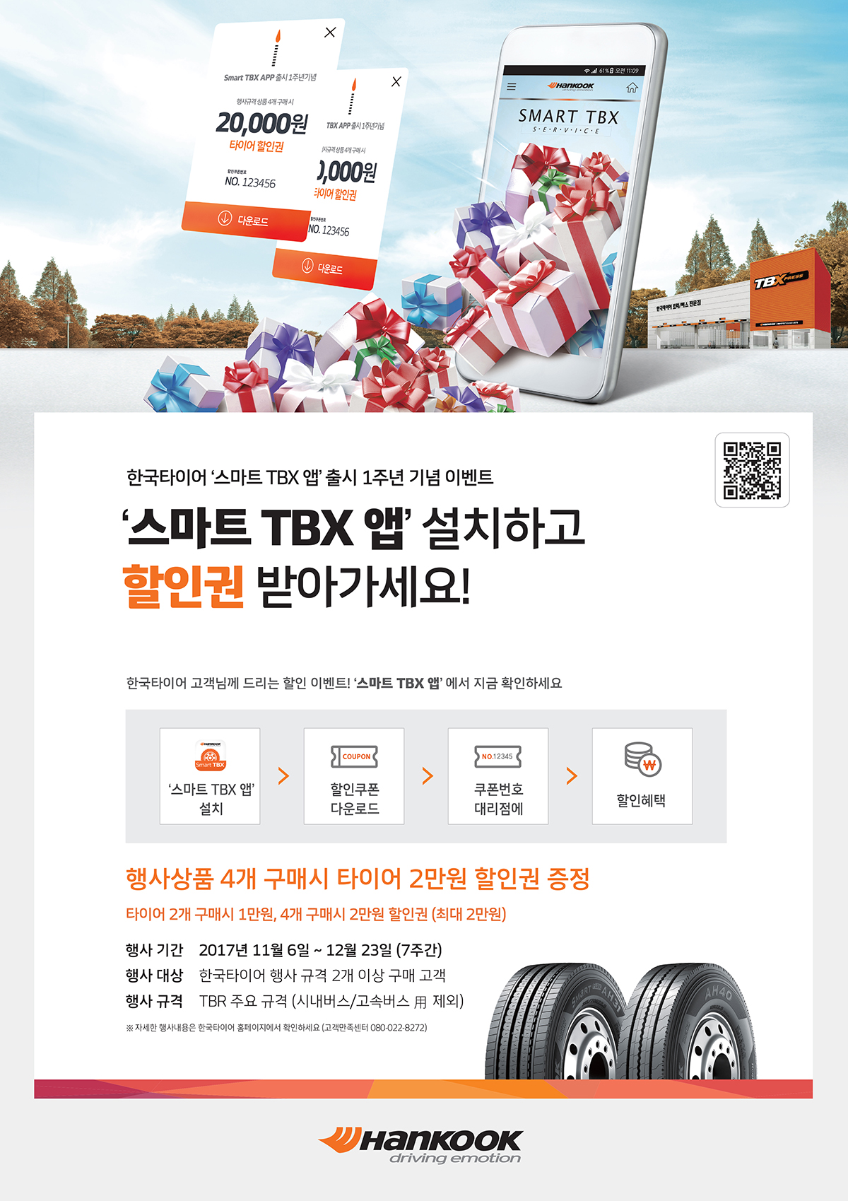 스마트폰에 ‘스마트 TBX 앱’이 설치된 고객이면 누구나 참여 가능하다. ‘스마트 TBX 앱’을 통해 할인쿠폰을 다운로드 받은 후, 한국타이어 트럭·버스 전문매장을 방문하여 한국타이어 상품을 △2개 구매 시 1만원 상당의 할인 혜택 △4개 구매 시 2만원 상당의 할인 혜택을 제공한다.
