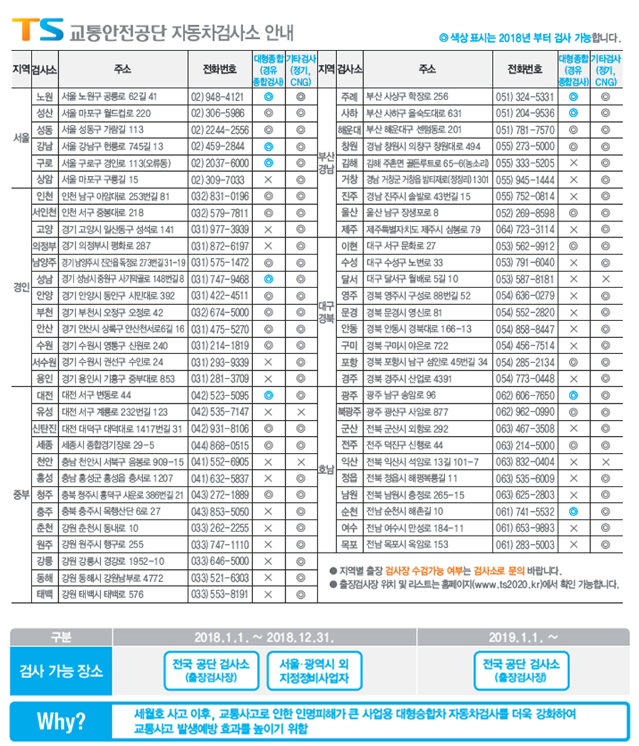 아울러, 2019년 1월 1일부터는 중형 및 사업용 대형승합차의 6개월 검사주기 적용시점이 기존 차령 5년 초과에서 8년 초과로 완화되어 수검자 부담이 감소할 예정이다.