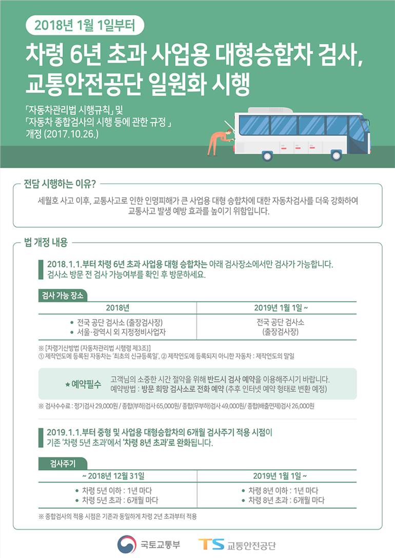 개정안에 따라, 2018년 1월 1일부터는 교통안전공단 자동차검사소나 서울특별시 및 6대 광역시를 제외한 지역에 등록된 자동차종합정비업체(민간 지정업체)에서만 차령 6년 초과 대형버스 자동차 검사가 가능하다.