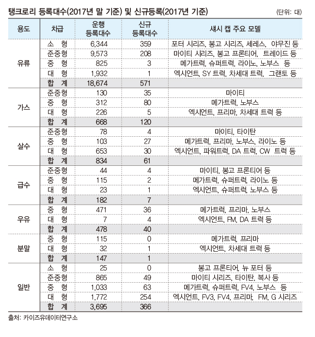카이즈유데이터연구소에 따르면, 1톤 소형급부터 27톤 대형급까지 탱크로리로 분류된 특장시장은 2017년 말 전체 등록대수 기준, 총 2만 4,678대 수준인 것으로 나타났다. 2017년만 놓고 봤을 땐, 총 1,166대의 탱크로리가 신규로 등록됐다.