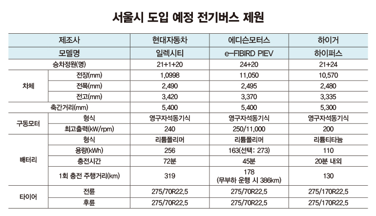 관련 업계에 따르면, 서울시 전기버스 도입을 위한 시행기관인 서울특별시버스운송사업조합은 지난 6월 20, 21일 양일간 환경부 보조금 지급 자격을 갖춘 전기버스 8개 브랜드를 대상으로 신정동에 위치한 양천 공용버스차고지에서 실제 운행 중인 버스 노선에서 시범운행 테스트를 진행한 결과, 현대차(일렉시티), 에디슨모터스(e-FIBIRD PIEV), 중국 하이거(하이퍼스)를 전기버스 공급 대상업체로 선정했다.