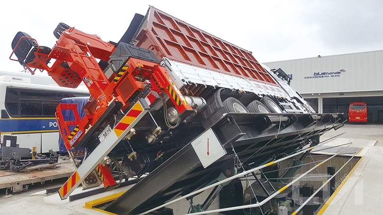 검증 설비를 살펴보면 경사각도 시험기는 최대 35도까지 시험이 가능하다. 차량총중량이 차량중량의 1.2배 이상이면 35도, 1.2배 이하면 30도의 경사도 테스트를 거쳐야 하는데 이를 모두 충족하는 수치다.