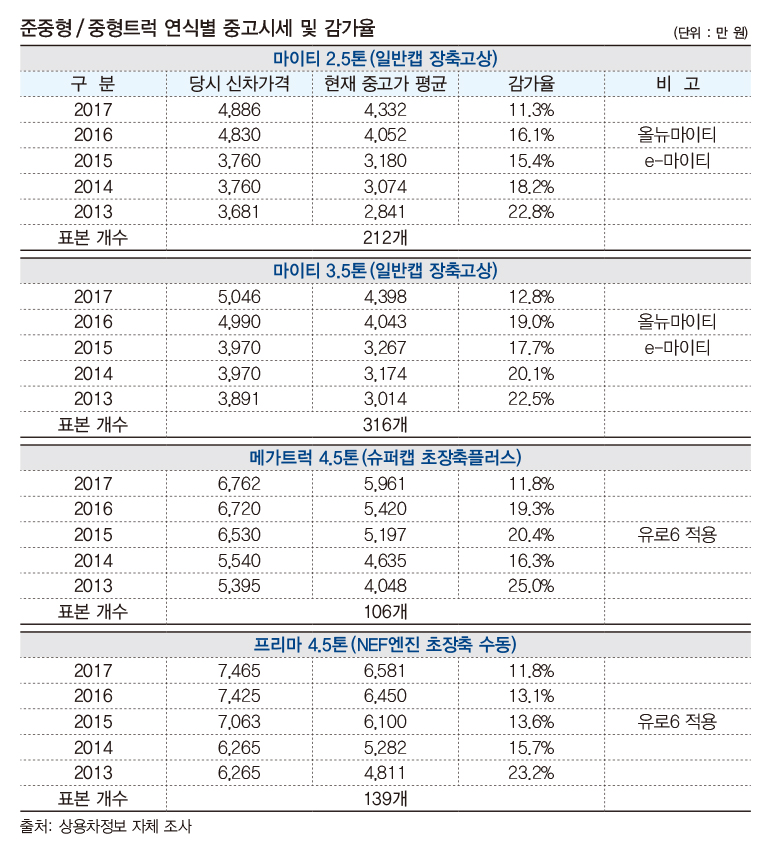 대표적으로 준중형급 시장을 지배하고 있는 현대차 ‘마이티’의 공개 매물 528대의 매물표본을 분석한 결과, 출고된 지 만 5년 된 2013년식 ‘e-마이티(일반캡 장축고상 기준)’의 감가율은 2.5톤과 3.5톤이 각각 22.8%와 20.0%에 지나지 않은 것으로 나타났다.
