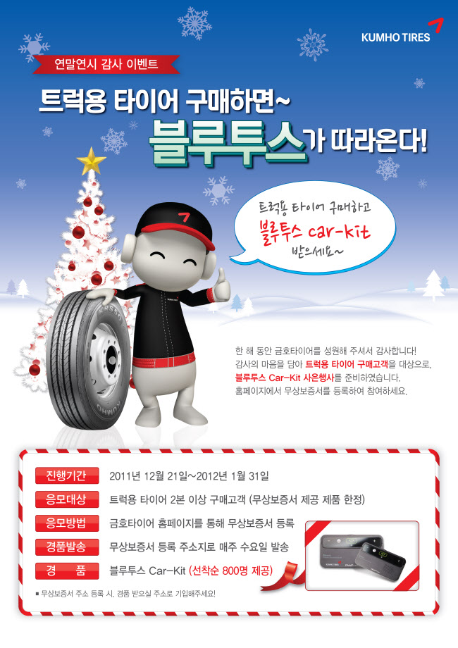 금호타이어가 2011년 한 해 동안 고객들로부터 받은 성원에 보답하기 위해 감사 행사의 일환으로 블루투스 카키트(Car-Kit)를 증정하는 사은 행사를 마련했다고 21일 밝혔다.