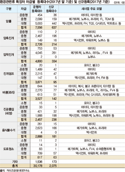 국토교통부의 자동차 등록 원본을 가공 및 제공하고 있는 카이즈유데이터연구소에 따르면, 소형급부터 대형급까지 환경관련류로 분류된 특장차 시장규모는 2017년 말 전체 등록대수 기준, 3만 178대 수준인 것으로 나타났다. 2017년만 놓고 봤을 땐, 총 2,075대의 환경관련류 특장차가 국내에 신규로 등록됐다.