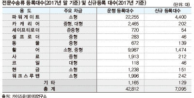 국토교통부의 자동차 등록데이터를 가공·제공하고 있는 카이즈유데이터연구소에 따르면, 소형급부터 대형급까지 전문수송류로 분류된 특장시장 규모는 2017년 말 등록대수 기준, 4만 2,812대 수준인 것으로 나타났다. 2017년만 놓고 봤을 땐, 총 7,095대의 전문수송류 특장차가 국내에 신규로 등록됐다.