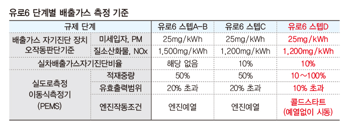 하지만 유로6D 규제에서는 전체 출력의 10%를 초과하는 시점부터 엔진 유효출력 범위를 설정한 뒤 배출가스를 측정한다.