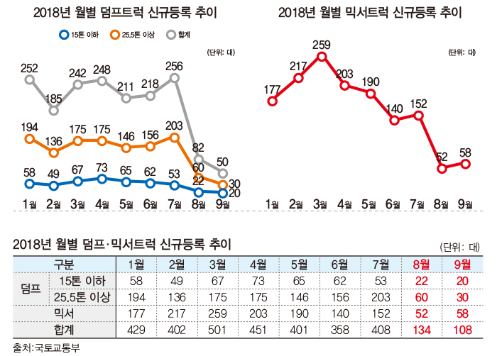 이는 국토부의 신규등록 자료에서 극명하게 나타난다. 수급조절 지침이 본격 시행된 8월에 이어 9월에도 덤프·믹서트럭 신규등록은 급락했다. 심지어 9월 실적은 곤두박질쳤던 8월보다도 더 떨어졌다.