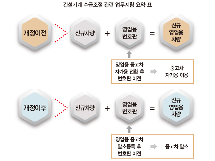 건설업계 한 관계자에 따르면 “8월 이전에는 영업용 중고차를 자가용으로 전환한 뒤, 기존 영업용 번호판을 신규 차량에 이전하는 것이 얼마든지 가능했다.”며, “그런데 번호판 이전 시 말소조건이 따라붙는 새로운 수급조절 지침은 중고차의 자가용 전환 및 확산을 원천 차단한 것”이라고 분석, 최근 몇 달 동안의 덤프와 믹서트럭 침체 분위기를 그대로 전했다.