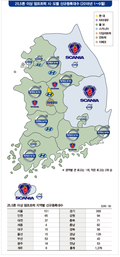 특히, 강원지역은 전통적으로 스카니아 브랜드의 선호도가 높은 것으로 알려졌는데, 트랙터와 함께 덤프트럭 또한 스카니아 브랜드가 강세를 보였다. 스카니아 30대, 볼보트럭 24대. 현대 18대, 만트럭 10대, 타타대우·다임러 각각 5대, 이베코 2대다.