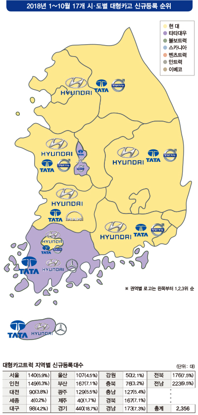 현대 13개 지역 석권, 타타대우는 4개 지역 1위